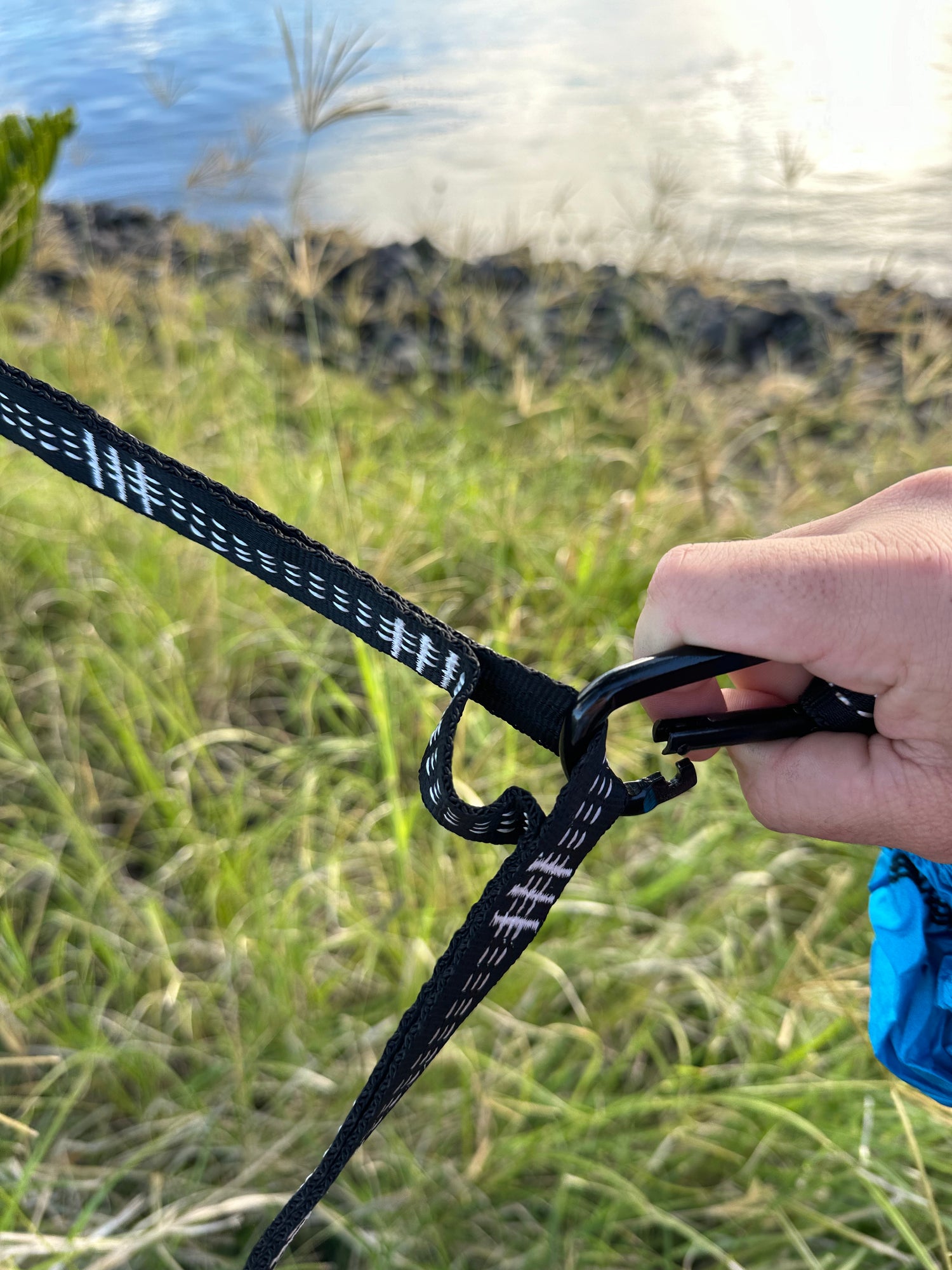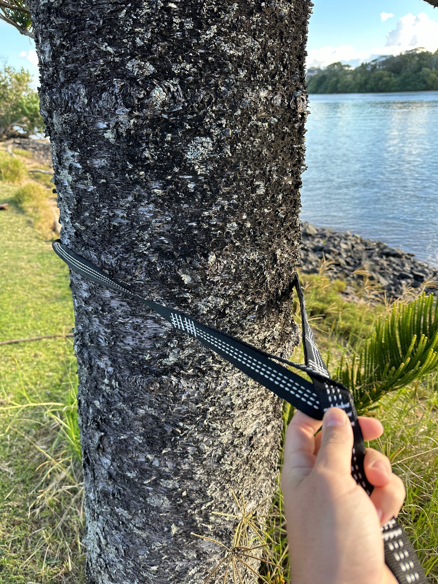 Wrap strap around tree, pole or any other sturdy object. Feed back through the open loop. No knots required